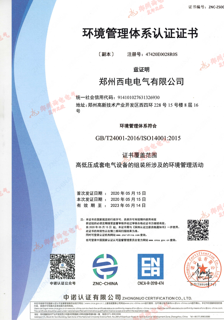 環(huán)境管理體系認證證書