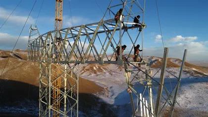 國(guó)網(wǎng)青海送變電公司施工人員在青豫特高壓直流工程建設(shè)現(xiàn)場(chǎng)組立鐵塔