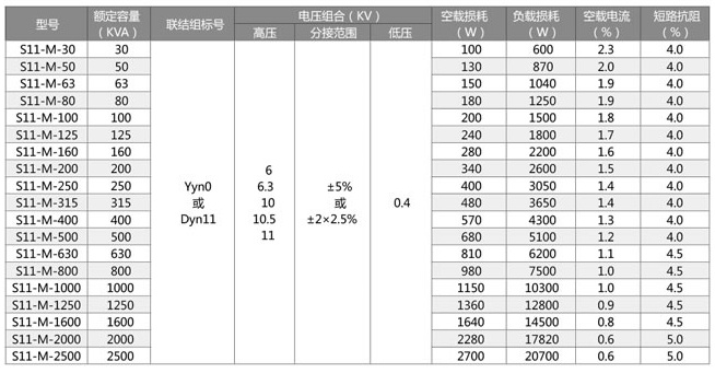 本公司研發(fā)生產(chǎn)的S11-M系列全密封油浸式電力變壓器具有低損耗、低噪音、高效率的優(yōu)點,可取得良好的節(jié)能效果并減少污染。全密封式變壓器與普通油浸式變壓器相比,取消了儲油柜油體積的變化由波紋油箱的波紋片的彈性來自動調(diào)節(jié)補償,變壓器與空氣隔絕防止和減緩油的劣化和絕緣老化,增強運行可靠性正常運行免維護。符合以下標準: